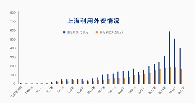 上海對外商外企幾十年始終如一日地熱忱服務,持續吸引了外資,贏得了國內外的贊譽。截至2017年12月底,上海累計引進外資項目9.14萬個,合同外資4242.25億美元,實到外資2231.4億美元,引進625家跨國公司地區總部、426家外資研發中心。