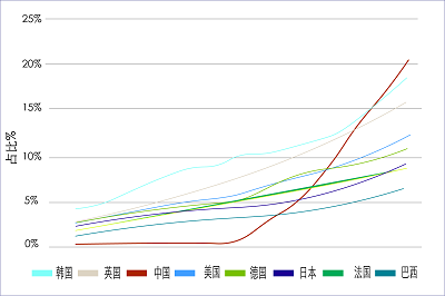 圖6電子商務在各國零售銷售中比例