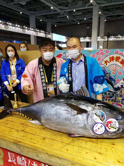 長崎自2018年以來每年組織企業參加進博會,還每年在進博會的日本館里舉辦藍鰭金槍魚的解體秀,這是日本館里最具人氣的活動。長崎縣水產物海外普及協議會、長崎縣政府、長崎縣貿易協會上海代表處、都出人出力支持這個活動。由于解體秀所用刀具的特殊性,在辦理進場手續時,得到了上海各級政府、各部門的大力協助。
