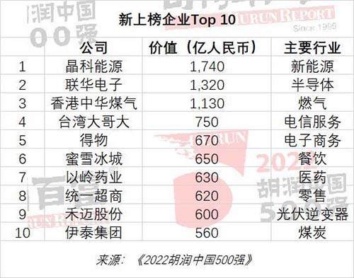 胡潤研究院1月13日發布《2022胡潤中國500強》(Hurun China 500 Most Valuable Private Companies 2022),列出了中國500強非國有企業,按照企業市值或估值進行排名。上市公司市值按照2022年11月15日的收盤價計算,非上市公司估值參考同行業上市公司或根據最新一輪融資情況進行估算。