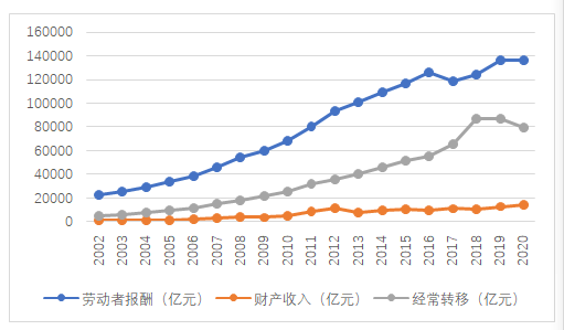 我國居民收入占比最高和增長速度最快的是勞動者報酬,其次是轉移性支付,而居民的財產性收入幾乎一直徘徊在收入層級的低端。單獨拿出2020年的數據來看,在居民的可支配收入中,有59%為勞動報酬,有34%為轉移支付,而財產性收入僅占6%,是勞動報酬的十分之一左右。