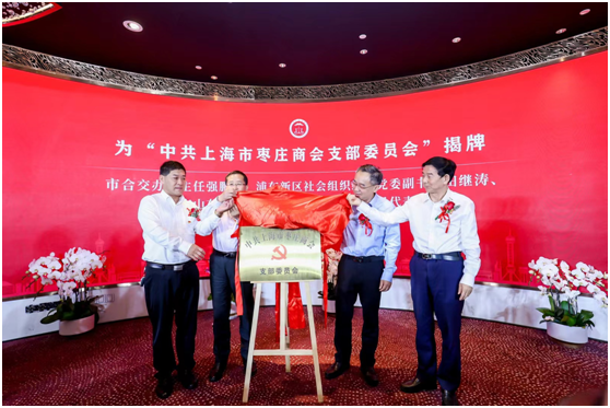 上海市人民政府合作交流辦副主任強鵬程、上海市浦東新區社會組織綜合黨委副書記田繼濤、上海市山東商會會長高洪彥、棗莊商會黨員代表杜培河,共同為“上海市棗莊商會支部委員會”揭牌。