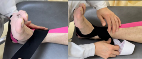 第?步肌?貼扎:腓??短肌促進貼法。踝關節背屈內翻。采用I形貼布,將錨固定于腓?外側?上1/3-2/3處,以?然拉?向第5跖?粗隆延展,尾端固定于?底。