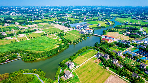 嘉興平湖新倉鎮,綠綠的農田和零散在田間的房屋和諧共處,衫青港兩岸優美的文化造景,涼亭、廊橋、棧橋和小觀景碼頭等休閑設施以及蜿蜒的步道,在高低錯落的灌木花叢和樹木的點綴下相映成趣。