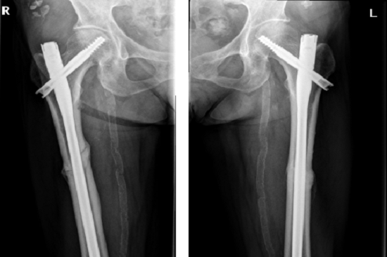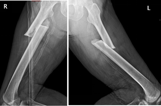 2018年上海交通大學醫學院附屬仁濟醫院創傷骨科碰到了一位從馬路臺階上摔倒的老年女性患者,拍片顯示是雙側股骨干近三分之一骨折(圖1),很對稱。