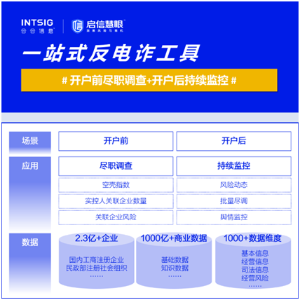 為幫助金融機構充分運用數字化手段提升反制能力,合合信息旗下啟信寶企業端產品“啟信慧眼”,基于人工智能及商業大數據技術,近期推出一站式反電信網絡詐騙工具。