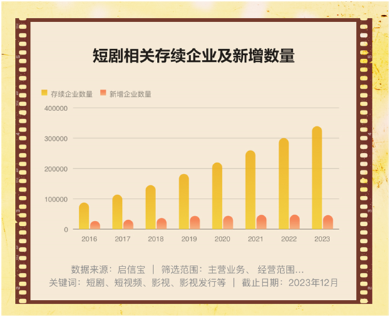 2016年至今,我國短劇相關企業注冊量增速、存續企業數量均呈持續增長態勢。啟信寶《短劇版圖》顯示,截至2023年12月,我國現存短劇相關企業超過30萬家,是2016年的近4倍。