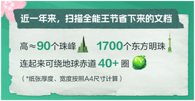 以智能掃描及文字識別APP掃描全能王為例,用戶只需動動手指,即可在辦公、教育等多個場景當中,提高文檔電子化效率,減少紙張等資源浪費,參與節能減排。數據顯示,按照標準的A4紙張尺寸計算,用戶2023年掃描的文檔豎著摞起來,高度約等于90個珠峰、1700個上海的東方明珠。將這些文檔按寬邊并排連起來,可繞地球赤道超過40圈。