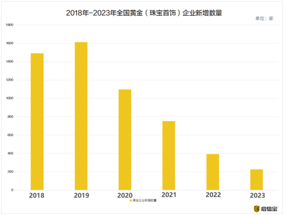 根據啟信寶數據,截至2023年底,全國黃金珠寶企業存續數量超過12000家。該行業在2019年出現注冊新增熱潮,當年新增企業數量超過1600家。但是從2019年至2023年,新增黃金珠寶企業數量呈現逐年下降的趨勢,2023年新增企業數量僅為200余家。