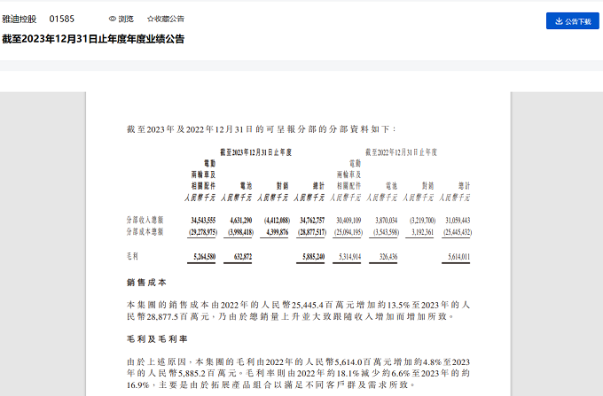 銷售成本288.78億元!雅迪控股2023年毛利率減少6.6%