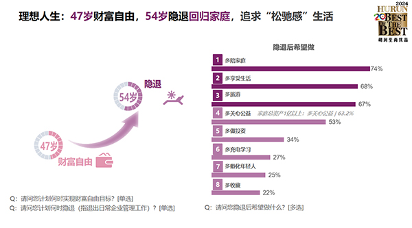 受訪高凈值人群平均希望47歲實現財富自由,比去年增長1歲,54歲“隱退”(指退出日常企業管理工作)。對于“隱退”后的設想,更多人期望回歸家庭,“多陪家庭”最受歡迎,占比74%,其次是“多享受生活”,占比68%,“多旅游”和“多關心公益”排在第三和第四,分別占比67%和53%。對于超高凈值人群,63%的受訪者隱退后更熱衷公益。