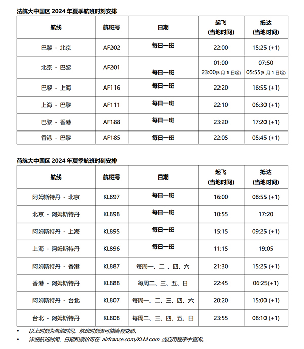 面向大中國區市場,法航和荷航將從2024年3月31日至10月26日每周運營44個客運航班,從4個目的地往返于阿姆斯特丹史基浦機場和巴黎戴高樂機場:北京(每周 7個法航航班和 7個荷航航班)、上海(每周 7個法航航班和 7個荷航航班)、香港(每周 7個法航航班和 4個荷航航班)和臺北(每周 5個荷航航班)。以上航班將由波音 777、787-9和空客 350-900機型執飛。