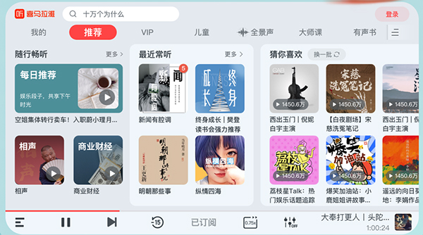 今年北京車展上亮相的喜馬拉雅車載版提升了猜你喜歡、隨心暢聽、最近常聽的使用功能,升級一鍵收聽來滿足多種使用需求。喜馬拉雅車聯網還為汽車品牌提供了賬號打通、語音控制、語音點播、無縫流轉、手勢識別、千人千面、快捷支付等運營能力,為用戶帶來更加便捷、智能的車載音頻體驗?;谲囍鞯鸟{駛行為和內容偏好,喜馬拉雅還創新推出了場景引擎,為用戶提供不同場景模式下的音頻內容收聽體驗。