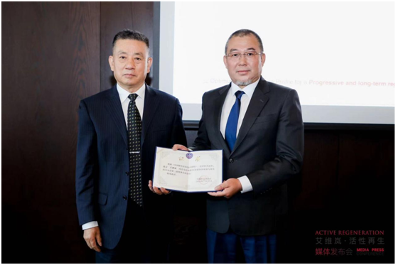 王晉岳已被選為中國整形美容協會美容與再生醫學分會第二屆理事會副會長。4月26日,張斌在艾維嵐-活性再生的發布會上,向王晉岳頒發證書。(圣博瑪集團供圖)