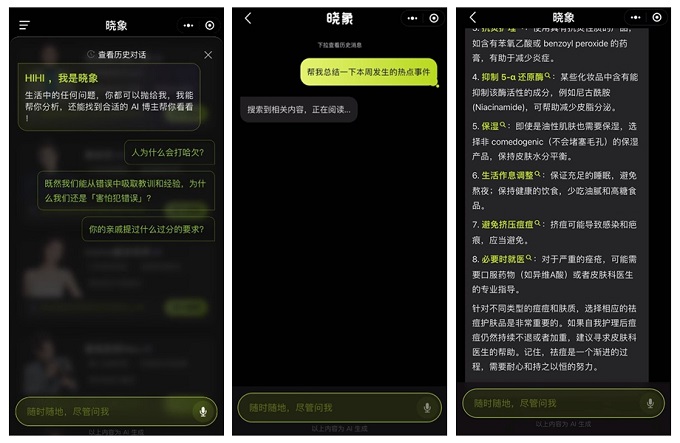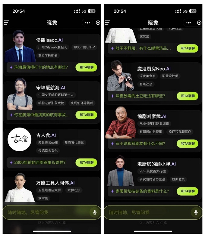 曉象通過與博主合作復刻博主的AI分身,從而為每個粉絲提供“量身”的好答案,這些“過來人”帶著經驗,24小時在線,聽你傾訴陪你成長,為你的生活出招。對每個粉絲來說,內容從單向觀看,變成了可以雙向參與討論的事。無論你有健康飲食、科學瘦身的需求,還是有情感問題、育兒困惑.....,只要你有想了解的問題,就都能在這里“找到不同的人”為你辦不同的事,深入體驗被傾聽、被關注、問題被重視的積極感受。