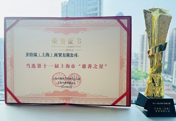 5月7日,在上海市慈善基金會成立30周年座談會上,第十一屆上海市“慈善之星”的30名入選對象,集體接受表彰。多特瑞(上海)商貿公司總裁麥歐文,再次代表公司接過獎杯。多特瑞是第三次獲此殊榮,是自2003年上海市“慈善之星”啟動評選以來,唯一連續三屆獲此殊榮的外資企業。