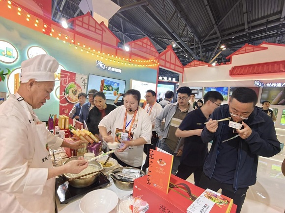 “小面起鍋了,上一輪沒吃到的,這一鍋安排起了?!彪S著“冕宴小面”煮面師傅的吆喝聲,觀眾紛紛圍到小面展區,接過一碗碗麻辣鮮香的小面大快朵頤。