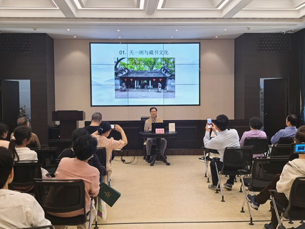 本期講座的主題是“天一閣與藏書文化”,邀請原天一閣博物院研究館員、寧波市收藏家協會理事、副秘書長王宏星,講述我國現存歷史最悠久的私家藏書樓——天一閣藏書樓的故事,分別從天一閣閣主范欽的出身與家教、范欽為官清廉諸因素、天一閣藏書文化特色、天一閣社會化諸動因以及天一閣公有制后發展這五個方面進行了詳細而生動的介紹。