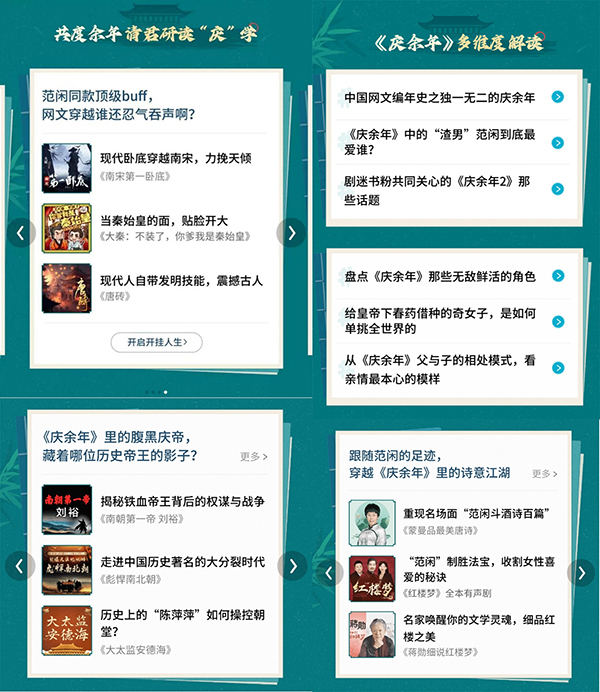 喜馬拉雅站內見證了從娛樂、歷史、文學、人性、職場、新聞、科幻等多個視角的深入解讀,內容既通俗又富有深度,旁征博引,引人入勝。其中,范閑默寫紅樓的梗在有聲世界中引發了一場對紅學的延展討論,使得《慶余年》在有聲世界里與《紅樓夢》、《甄嬛傳》形成了跨時空的對話,成為人們追更、催更過程中的一大樂趣。喜馬拉雅發起的搶先聽慶余年&研讀慶學活動,更是吸引了累計超過200萬人觀看活動頁面,彰顯了IP強大的影響力和用戶黏性。