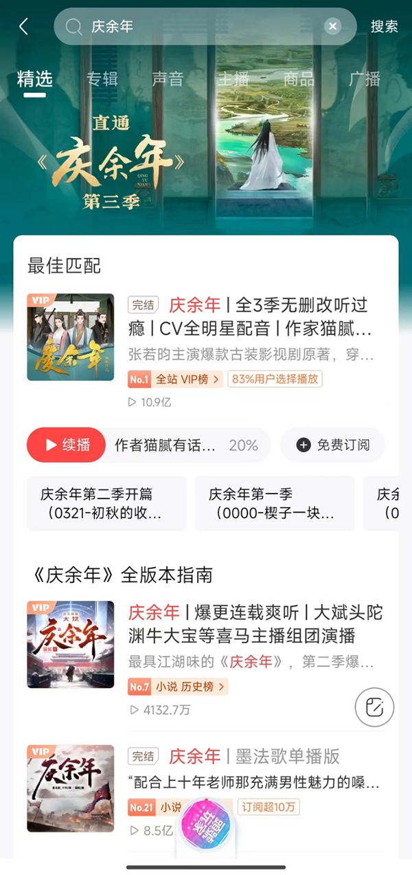 余年有幸,與君相逢。喜馬拉雅借著平臺匯聚的海量文史哲品類,從五一假期開始就開啟了宣發推廣,上線匯聚了和《慶余年》相關的播出版本、周邊討論、熱點話題,挖掘原著故事內容中與歷史權謀、職場、個人成長、詩詞等相關內容,帶動站內《慶余年》話題討論,與影視IP熱播遙相呼應,在碎片化的生活場景下,方便用戶追聽。