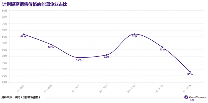 進一步分析顯示,能源行業提高銷售價格的意愿顯著下降,僅有33%的能源公司預計提高價格,相比之下,2023年下半年和2023年上半年分別有52%和62%的公司預期提價。這一變化主要反映了全球能源價格漸趨穩定的趨勢。在考慮國際業務時,能源行業最關注的是獲取技術和市場多元化,這兩個因素分別占24%和20%。雖然在開拓新市場時強大的品牌至關重要,但能源行業內企業更注重將全球業績增長、創新與效率作為競爭優勢。