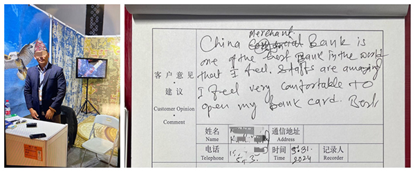 次日一早,GURUNG先生如約來到支行。為加快業務辦理效率,支行特意安排了英語流利的員工為其服務。業務辦理完成后,大堂員工貼心的協助GURUN先生綁定了微信、支付寶等支付渠道,并贈送了英文版支付便利化指南核上海城市旅游交通地圖。GURUN先生對招商銀行能對境外人士提供如此高效、便捷的服務大加贊賞。并不顧時間緊迫,堅持要在支行意見簿上表達自己的感謝。