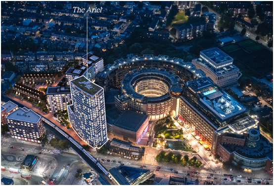 The Ariel是這里唯一一座獨立塔樓,由開發商三井不動產英國公司 (Mitsui Fudosan UK)出資建造,擁有167套私人公寓和頂層公寓,可從各個方向飽覽倫敦的美麗景色。這座新建筑出自著名設計師之手,設立了一系列專屬設施,包括:持續禮賓服務的大堂和共享辦公空間,配置普拉提器械、瑜伽和PT工作室的健身套房,居民休息室和酒吧,私人會議室、宴會廳。
